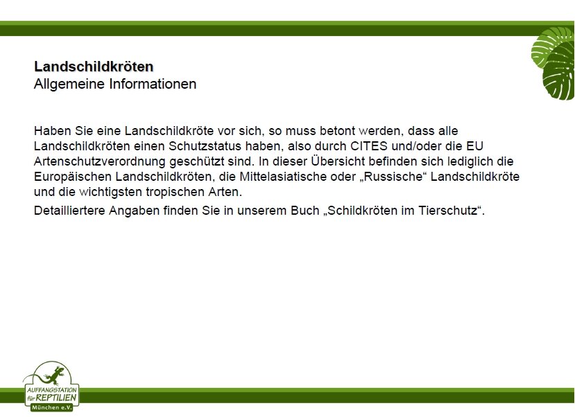 Bei einem Fundtier kann es sich entweder um ein entlaufenes oder aber um ein augenscheinlich bewusst ausgesetztes (also herrenloses) Tier handeln. In jedem Fall müssen Sie Ihren Fund zuallererst der Gemeinde melden, in der das Tier gefunden wurde. Nach dem deutschen Fundrecht handelt es sich bei dem Tier nämlich (genau wie bei einem verlorenen Schlüssel, Geldbeutel, etc.) um eine Fundsache. Allein die Gemeinde hat über den weiteren Verbleib des Tieres zu entscheiden und kann z.B. uns, also die Auffangstation für Reptilien, München e.V. oder auch ein regionales Tierheim damit beauftragen, das Tier in seine Obhut zu übernehmen und zu pflegen, bis sich der Eigentümer meldet. Erst wenn die Gemeinde dem ausdrücklich zustimmt, dürfen wir das gefundene Tier direkt von Ihnen annehmen. Im Großraum München übernehmen wir die Meldung an die Fundgemeinde. Fundtiere können direkt, nach Terminvereinbarung, zu uns gebracht werden.